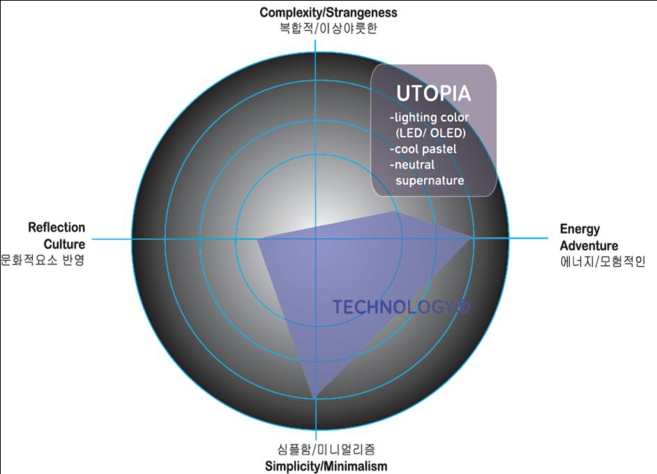 * Utopia 테마 CUBE navi 디코딩(decoding): 에너지/모험적인(energy/adventure) 큐브나비® 축은 LED라이팅 칼라에서 출발하는 쿨 파스텔 칼라의 부상을 알리는 소시오컬처 부분이다. 심플한 라이프와 그에따른 스마트한 미니멀 스타일이 특히 조명제품 아이템에 집중된다. 기존 크로매틱 칼라를 떠나 자연의 색감을 연출하는 뉴트럴 수퍼네이처 라이팅 칼라를 적용한 다양한 디자인 시도가 부각된다.