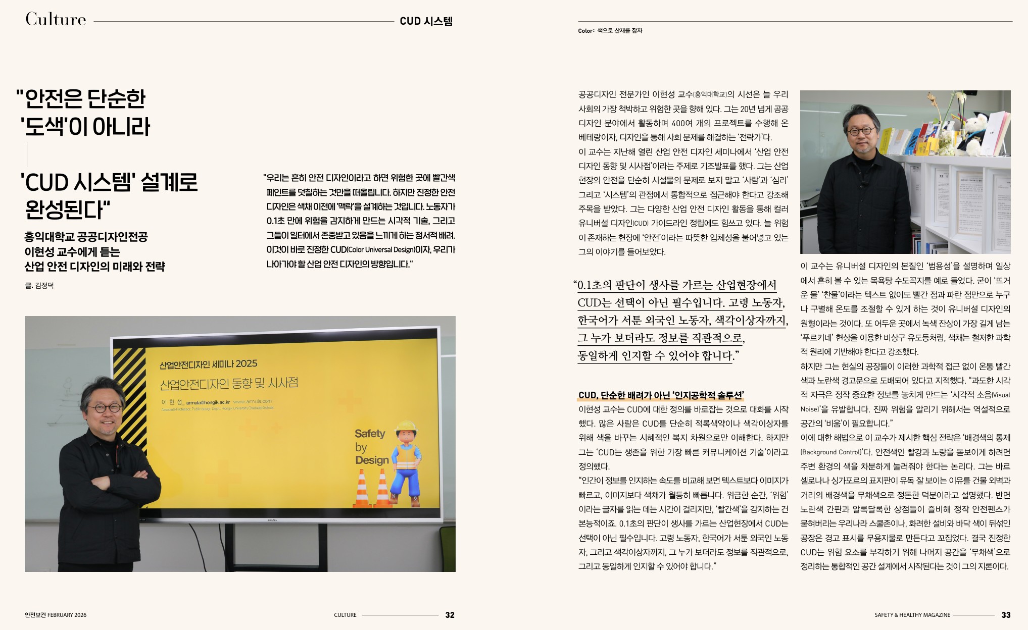 이 교수는 인터뷰를 마치면서 ‘디자인은 결국 문제 해결의 과정’이 라고 정의했다. 과거의 디자인이 제품을 잘 팔리게 하는 포장 기술이었다면, 미래의 디자인은 고령화, 다문화, 산업재해 같은 사회적 난제를 해결하는 핵심 전략이라는 것이다. 그는 ‘안전은 칠하는 것이 아니라 설계하는 것’이라는 확고한 철학을 통해 안전 디자인을 단순한 비용이 아닌 생명을 살리는 투자로, 나아가 국가의 품격을 높이는 사회적 안전망으로 확장시키고자 한다. 그는 표준 모델 정립과 정책적 지원을 통해 이러한 철학이 산업 현장 곳곳에 깊이 뿌리내리기를 바라고 있다. 차가운 쇳소리가 가득한 공장에 따뜻한 ‘디자인의 숨결’을 불어넣을 그의 행보가 대한민국을 더 안전하고 건강한 일터로 변화시키는 마중물이 되기를 기대해 본다.