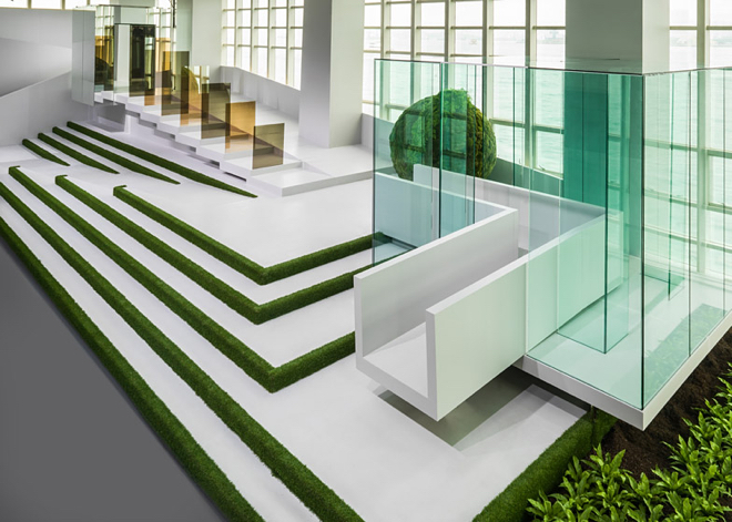입구에 들어서면 진회색빛 공간 안에 너비 3m 높이 4m의 큐브형 유리 구조물이 방문객을 반긴다. 하얀 철제 프레임이 양 옆의 유리면을 지탱한 모양새다. 가운데로 초록색 다리가 큐브를 통과하여 뻗어나가 다음 공간으로 발길을 안내한다. 입구를 지나면 한결 밝은 공간이 등장한다. 큼직하게 난 기존 창문을 십분 활용한 이곳에는 하얀색 계단과 경사로가 자리하였으며, 색유리판 조형물이 일부 경로에 수직으로 설치되어 있다.