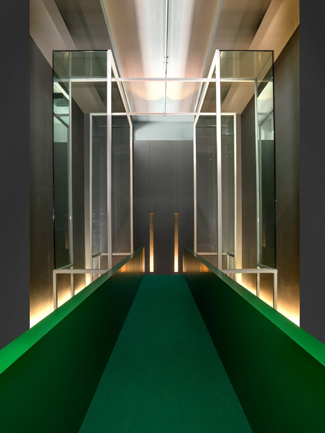 마지막에 자리한 공간은 COS의 최신 컬렉션 의상을 선보이는 곳이다. 의상을 입은 모델이 투명한 한 쌍의 유리 큐브를 오가며 걷고 있다. 큐브 하나는 투명 유리로 되어 있지만, 나머지 하나는 거울 마감되어 뒤편으로 보이는 빅토리아 항의 조명을 반사한다.