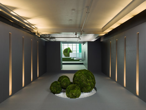이곳을 지나면 입구와 비슷하게 다시 진회색빛 공간이 등장한다. 바닥으로 이끼가 덮인 구체가 하얀 조약돌 무더기 위에 놓여 있는데, 일본식 정원의 재해석이라고 안드레 푸는 설명한다. 한편 “인스톨레이션 전체의 주 색상으로 연한 회색(cool grey)를 염두에 두었다”고도 이야기한다. 그는 이번 설치에 두 가지 색조의 회색을 이용하였는데, 회색이 연해졌다가 또 진해지며 공간에 변화를 준다.