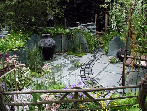 5.재활용 정원-지속가능한(sustainable) 디자인, 녹색 지구 등 환경에 대한 관심이 높은 가운데 고물차의 부품이라든지 산업재 재료들을 재활용한 정원들이 소개되었다. ‘Beyond The Pale’ 작품에서는 나무 울타리로 둘러싸인 기존의 정원 디자인에 대한 개념을 넘어서 산업철강재료, 바위로 속을 채운 금속상자 등을 이용하여 울타리를 만들었다.