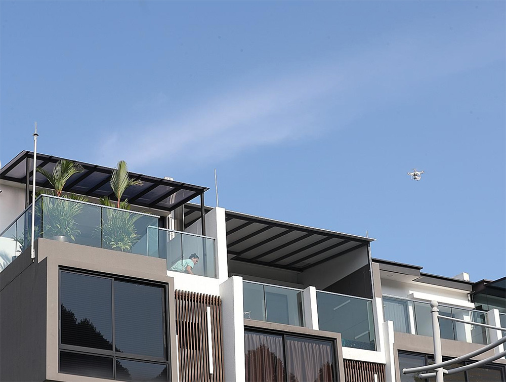 빗물과 화분에 고인 물에 뎅기열을 일으키는 모기의 유충이 발생하는 것을 막기 위해, 살충제를 뿌리고 번식 상황을 모니터링하는 드론의 활동 @ST PHOTO: TIMOTHY DAVID