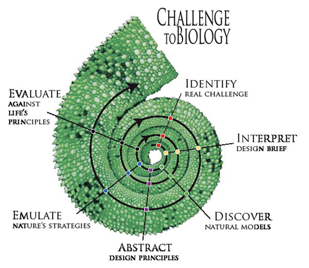 참고로, 1997년 재닌 베니어스(Janine Benyus) 바이오미미크리연구소 소장이 말한 ‘바이오미미크리(생체모방Biomimicry)’ 개념은 생명 ‘Bios’에 모방 ‘Mimesis’가 합쳐져, 38억 년 동안 진화하며 최적화가 항상 진행 중인 자연의 형태와 기능, 시스템에서 영감을 얻어 혁신을 이루는 일이다. 바이오미미크리 연구학회는 자연이 진화를 하는 방식에서 착안한 ‘디자인 나선Design Spiral’이라는 디자인 프로세스를 소개했다. ‘디자인 나선’은 1) 문제 파악하기, 2) 생물학적 자연 해석, 3) 영감 발견, 4) 자연의 패턴 추상화, 5) 디자인으로 모방하기, 6) 평가, 7) 발전 가능성 확인하기, 총 7단계를 거친다.