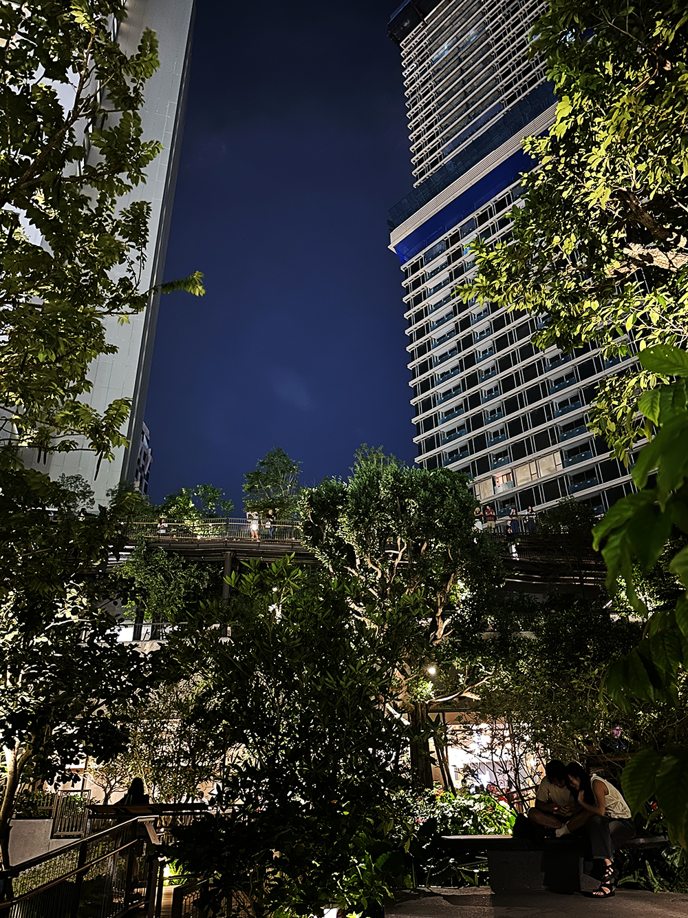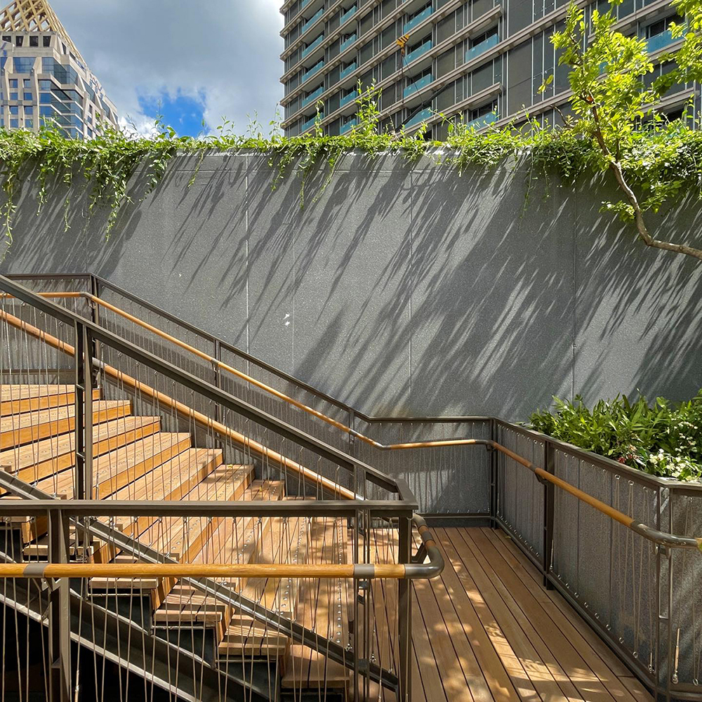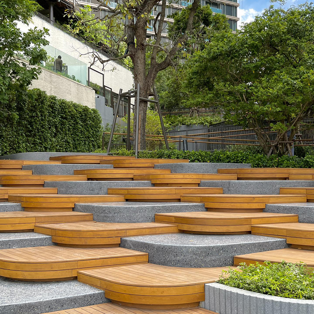 조경 디자인 측면에서 두짓 파크는 바이오필릭 디자인(Biophilic Design) 원칙을 충실히 반영했다. 태국 자생 식물로 꾸며진 정원, 물소리와 바람의 흐름을 고려한 공간 배치, 다양한 고도에서 펼쳐지는 조망 설계는 단순한 경관을 넘어 감각적 공원(Sensory Park)을 구현합니다. 특히 룸피니 공원과의 시각적 연계를 통해 도시의 녹지축을 확장한 점은 조경 디자인이 도시 차원의 그린 인프라와 어떻게 맞닿을 수 있는지를 잘 보여주고 있습니다.
