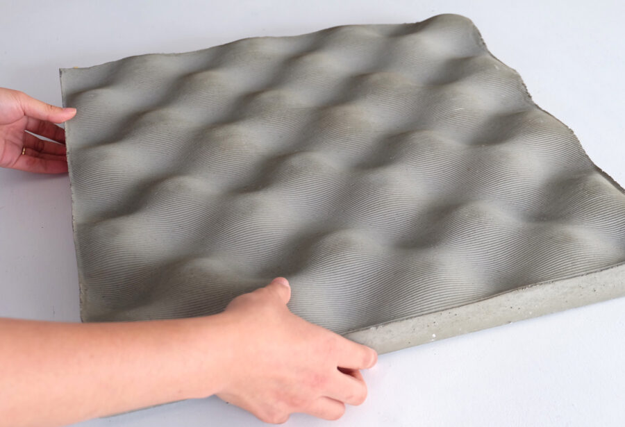 손으로 잡을 수 있을 정도의 두께를 가진 콘크리트 패널 샘플. 표면은 물결치듯 굴곡이 있고 미세한 홈이 더해져 있어, 냉각 효과도 겸하고 있다.