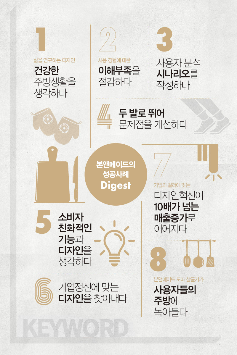 1. 삶을 연구하는 디자인 건강한 주방생활을 생각하다 / 2. 사용 경험에 대한 이해부족을 절감하다 / 3. 사용자 분석 시나리오를 작성하다 / 4. 두 발로 뛰어 문제점을 개선하다 / 5. 소비자 친화적인 기능과 디자인을 생각하다 / 6. 기업정신에 맞는 디자인을 찾아내다 / 7. 기업의 컬러에 맞는 디자인혁신이 10배가 넘는 매출증가로 이어지다 / 8. 본앤메이드 도마 살균기가 사용자들의 주방에 녹아들다