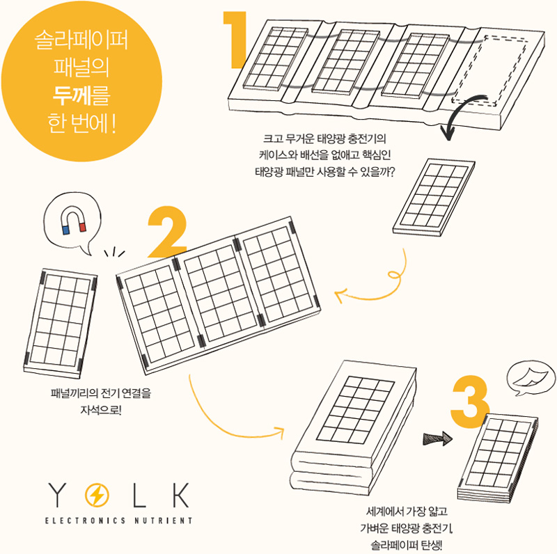 1. 크고 무거운 태양광 충전기의 케이스와 배선을 없애고 핵심인 태양광 패널만 사용할 수 있을까 ? / 2. 패널끼리의 전기 연결을 자석으로 ! / 3. 세계에서 가장 얇고 가벼운 태양광 충전기, 솔라페이퍼 탄생 !
