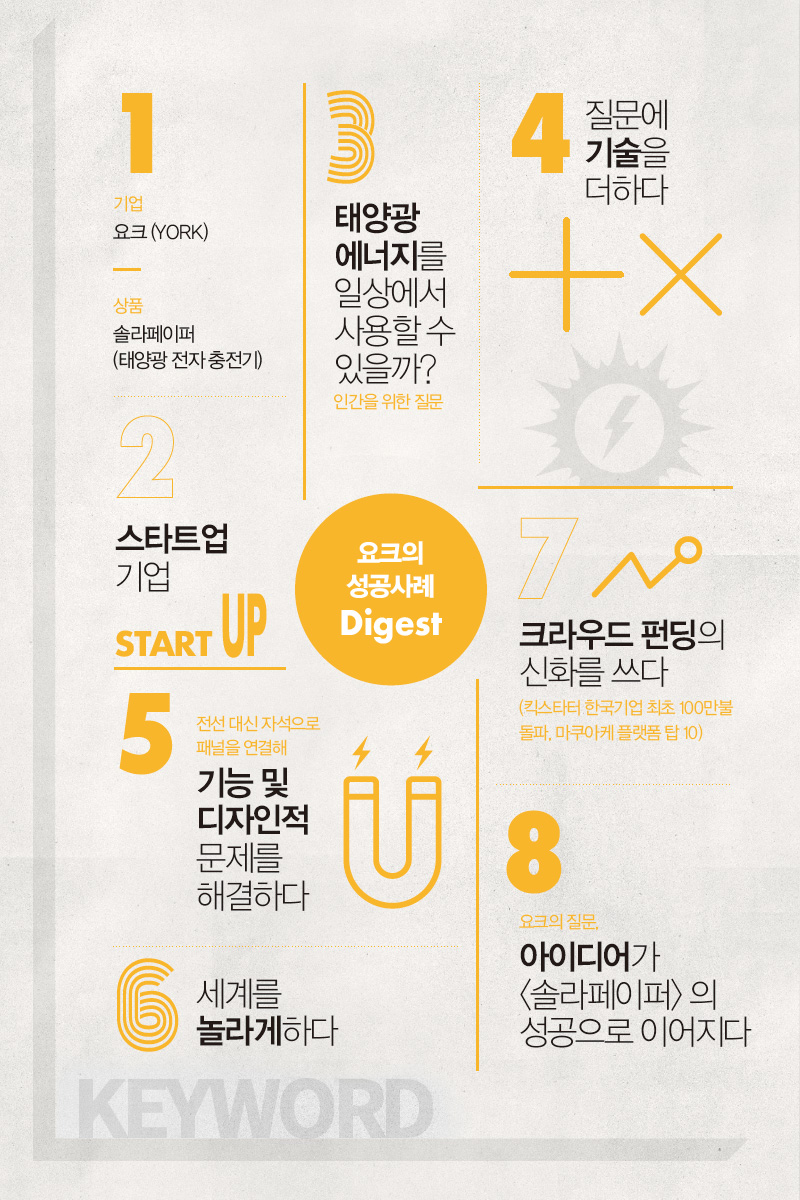 1. 기업 요크 (YOLK) 상품 솔라페이퍼 (태양광 전자 충전기) / 2. 스타트업 기업 / 3. 태양광 에너지를 일상에서 사용할 수 있을까? 인간을 위한 질문 / 4. 질문에 기술을 더하다 / 5. 전선 대신 자석으로 패널을 연결해 기능 및 디자인적 문제를 해결하다 / 6. 세계를 놀라게하다 / 7. 크라우드 펀딩의 신화를 쓰다 (킥스타터 한국기업 최초 100만불 돌파, 마쿠아케 플랫폼 탑 10) / 8. 요크의 질문, 아이디어가 <솔라페이퍼>의 성공으로 이어지다