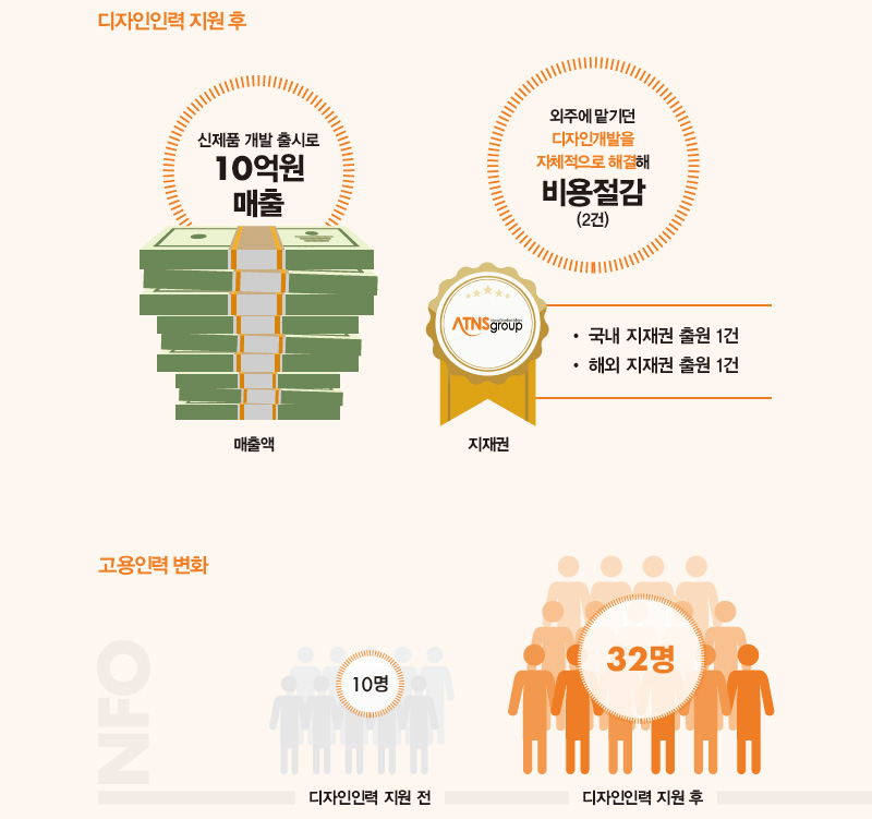 디자인인력 지원 후 신체품 개발 출시로 10억원 매출, 외주에 맡기던 디자인개발을 자체적으로 해결해 비용절감(2건) : 국내 지재권 출원 1건, 해외 지재권 출원 1건 / 고용인력 변화 : 10명 ▶ 32명