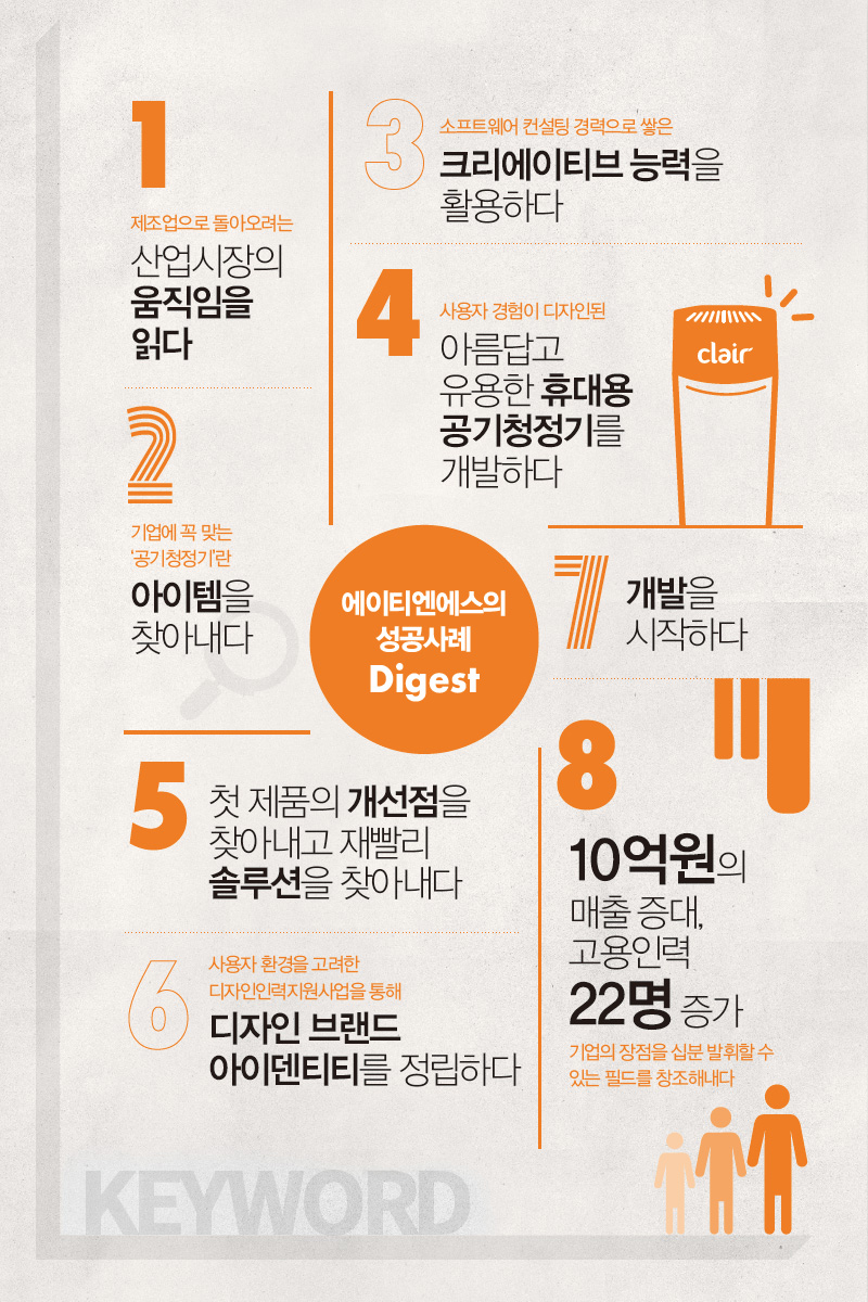 1. 제조업으로 돌아오려는 산업시장의 움직임을 읽다 / 2. 기업에 꼭 맞는 ‘공기청정기’란 아이템을 찾아내다 / 3. 소프트웨어 컨설팅 경력으로 쌓은 크리에이티브 능력을 활용하다 / 4. 사용자 경험이 디자인된 아름답고 유용한 휴대용 공기청정기를 개발하다 / 5. 첫 제품의 개선점을 찾아내고 재빨리 솔루션을 찾아내다 / 6. 사용자 환경을 고려한 디자인인력지원사업을 통해 디자인 브랜드 아이덴티티를 정립하다 / 7. 개발을 시작하다 / 8. 10억원의 매출 증대, 고용인력 22명 증가 기업의 장점을 십분 발휘할 수 있는 필드를 창조해내다