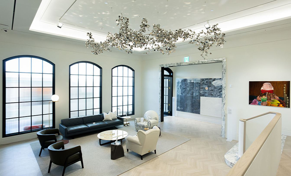 이 공간에는 박서보 작가의 묘법 시리즈와 김환기 작가의 작품 같은 보기 드문 걸작들이 자연스럽게 인테리어에 녹아들어 있었다. 전체적인 미감은 '현대식 한옥'에서 영감을 받은 듯, 격자 창살과 은은한 한지 마감이 조화를 이루며 세련되면서도 편안한 분위기를 자아냈다.