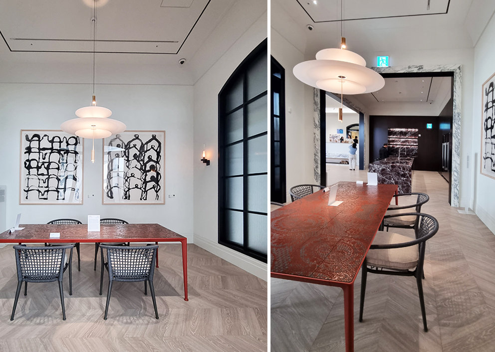 이와 조화를 이루는 로마넬리 부부의 아트 퍼니처와 도예 오브제는 다이닝 룸을 예술적 감성이 가득한 공간으로 완성한다. 가구와 오브제는 실용성을 넘어 예술 작품처럼 배치되어, 공간의 품격을 높이며 서세옥의 작품과 함께 강렬한 미적 하모니를 연출한다.