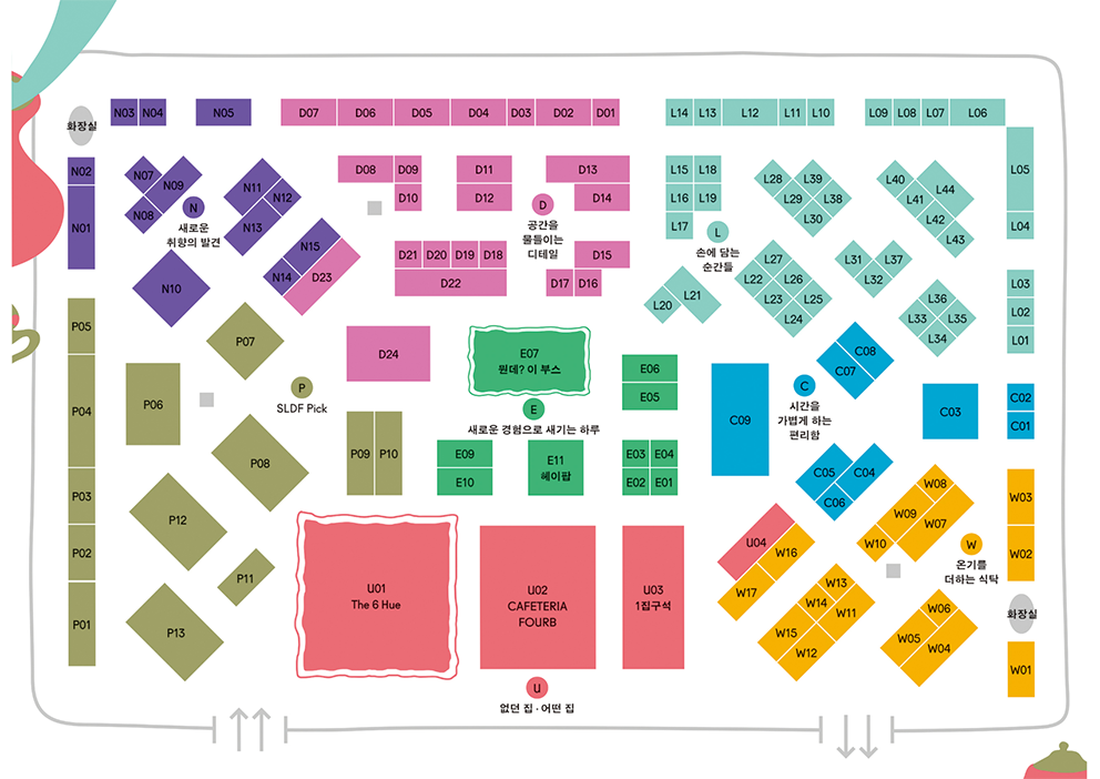 ‘새로운 경험으로 새기는 하루’, ‘새로운 취향의 발견’, ‘온기를 더하는 식탁’, ‘SLDF Pick’, ‘시간을 가볍게 하는 편리함’, ‘공간을 물들이는 디테일’ 여섯 개의 색으로 표현한 세부 주제를 통해 감각과 기억, 정서의 층위를 담아내며, 각각은 우리가 머무는 방식과 세계를 바라보는 태도를 드러내고 있다. 관람객은 여섯 가지 색상의 방을 거치면서 잊고 있었던 감각을 환기하고 자신의 내면의 소리에 귀 기울이게 된다. 그로 인해 ‘진정 내가 필요로 하는 집은 어떤 모습일까?’ 자연스럽게 스스로에게 질문을 하며 전시 관람을 시작하게 된다.