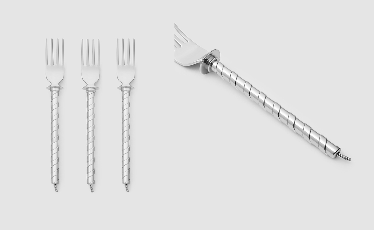 미니(Mini) 컬렉션은 소형 오브제의 미학을 극대화한 시리즈다. 베개나 쿠션의 볼륨을 본뜬 부드러운 곡선, 크래커 모양 핸들의 포크와 스푼, 생일 초 형태의 포크 등 작은 디테일에 담긴 위트와 감성이 돋보인다. 단순히 귀여운 형태를 넘어, 휴식, 축하와 같은 감정적 키워드를 시각화함으로써 감성적인 테이블 경험을 제안한다.