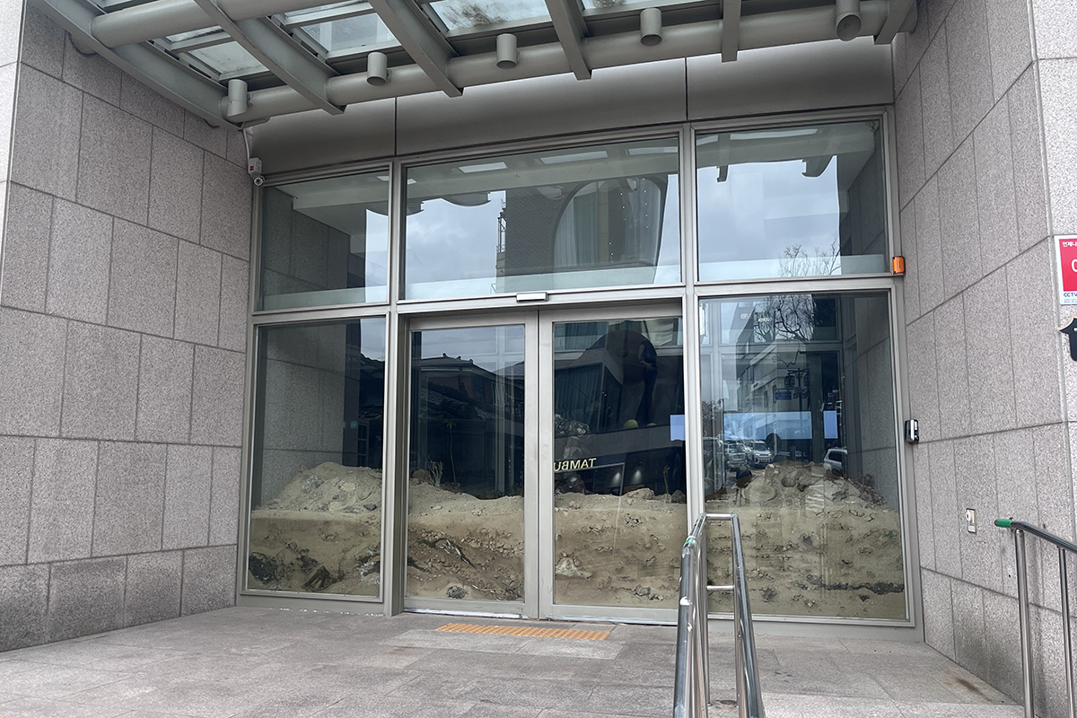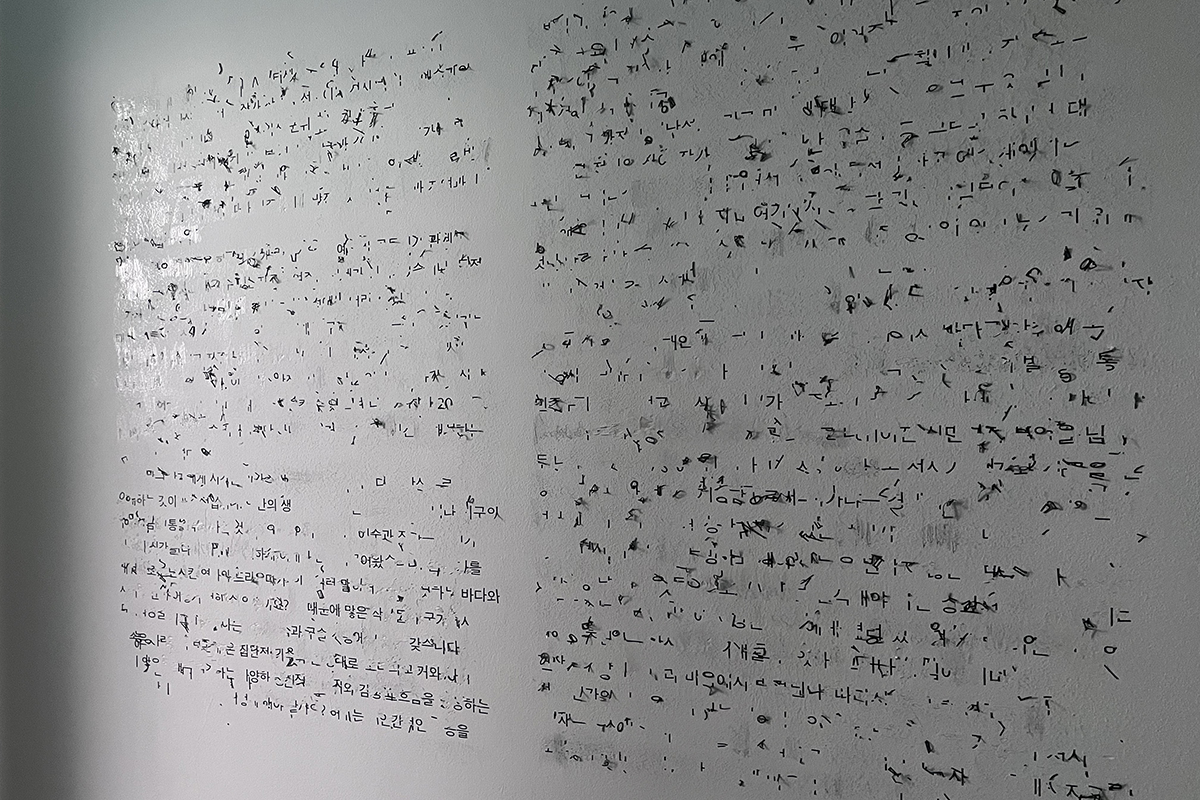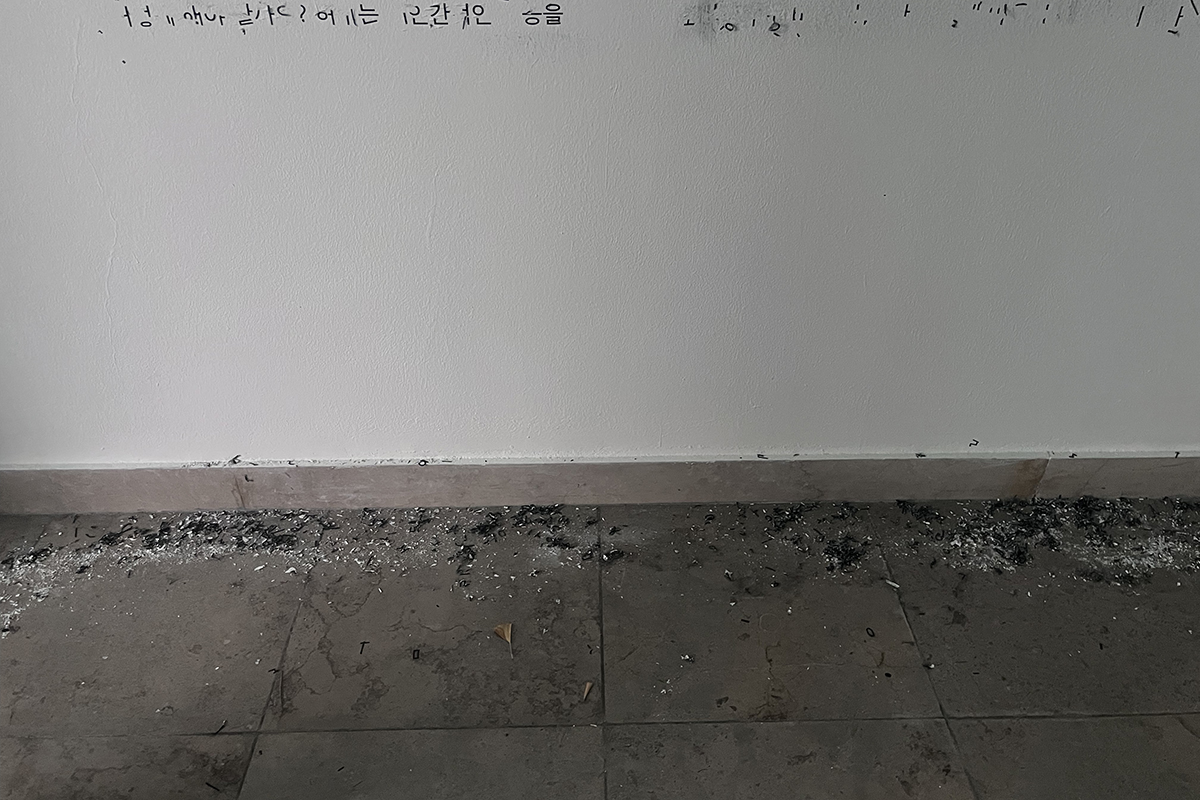 지하 1층 입구에 들어서면, 왼쪽 벽면에 전시 안내문 같은 글자들이 적혀 있다. 그런데 글자들이 부서지고 떨어져 나간 듯, 바닥에 떨어져 있다.
