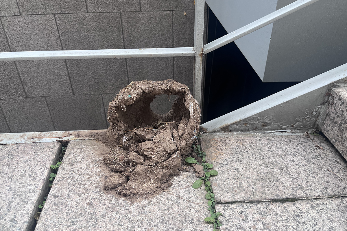 전시는 지하 1층으로 내려가는 계단에서부터 시작된다. 지하로 내려가는 계단 중간에 새 둥지가 있는데, 이는 이번 작품에 대한 작가의 서명이기도 하다. 새 둥지는 아르헨티나의 국조 오르네르의 둥지를 묘사한 것이며, 건물 전체가 작품이기 때문에 이곳에 작가의 서명을 남겼다고 한다. 인간 세상 속에 오두막을 짓는 오르네르의 뛰어난 적응력과 새로운 생태계를 구축하는 생명력이 작가의 작품 철학과 비슷하다고 생각했다고 한다. 외부 환경 변화에 따라 새 둥지가 손상되지 않을까 걱정되어 물어보니, 이미 손상이 많이 되었고, 여분으로 똑같은 새 작품을 하나 더 보관 중이라고 한다.