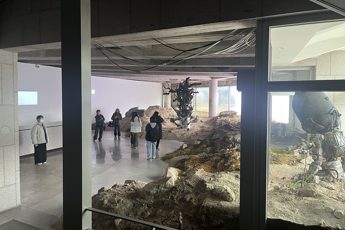 아드리안 비야르 로하스는 이번 전시에서 미술관 건물 전체를 이용한 장소 특정적 작품을 선보인다. 미술관 입구를 흙더미로 막고, 유리 너머로 보이는 내부는 콘크리트 골조를 노출시키고, 기이한 변종 기계 생물이 놓여져 있어 마치 멸망 이후, 인간이 사라진 지구를 표현한 것 같다. 2022년부터 이어온 ‘상상의 종말’ 연작과 새로운 설치 작업이 지하 1층부터 지상 3층까지 이어진다. 흙, 불, 식물 같은 자연의 요소들과 기계적이고 인공적인 요소들이 서로 얽혀 경계를 허물고 변종적인 형태, 조형물이 전시되어 있다. 또한 전시 공간마다 온도, 습도, 냄새까지 의도적으로 설정하여 공간이 주는 분위기 역시 전시의 일부가 된다. 컨테이너 형태로 미술관 밖으로 나온 매표소에서 입장 티켓으로 팔찌를 받을 수 있다.