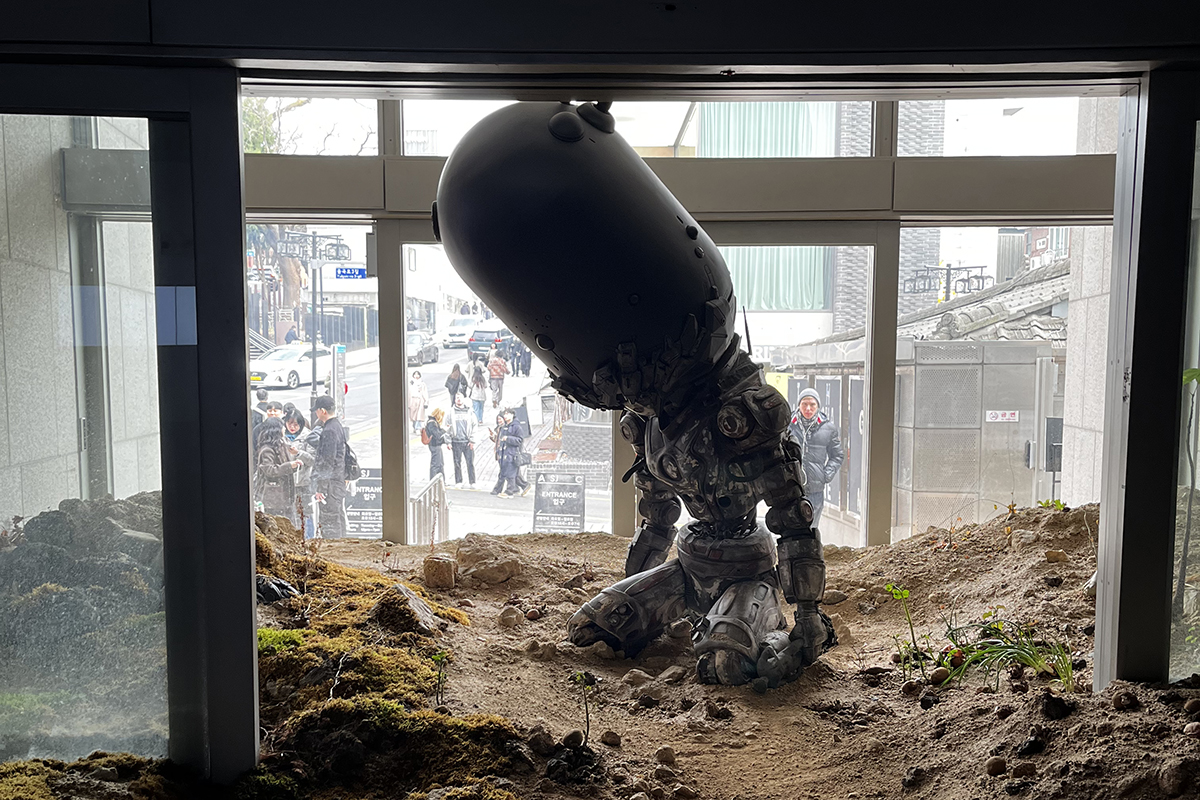 1층 전시장은 흙으로 뒤덮인 공간에 에일리언 같은 두 개의 기계 생물이 전시되어 있다. 작가는 인공지능과 협업하여 상상의 한계와 종말을 표현하고자 했다. 거대한 머리를 가진 로봇은 손에 미켈란젤로의 다비드상을 쥐고 있는데, 미래의 기술이 인간을 통제하는 듯한 느낌을 준다.