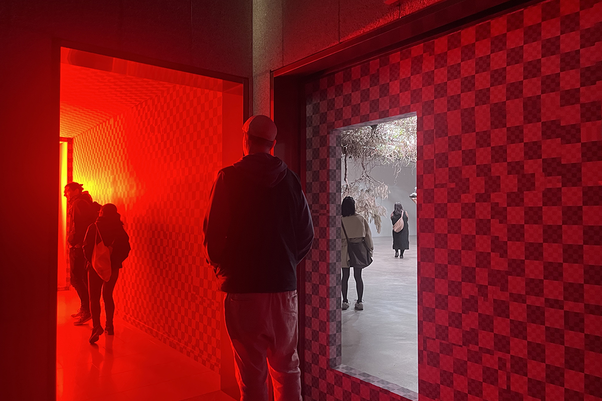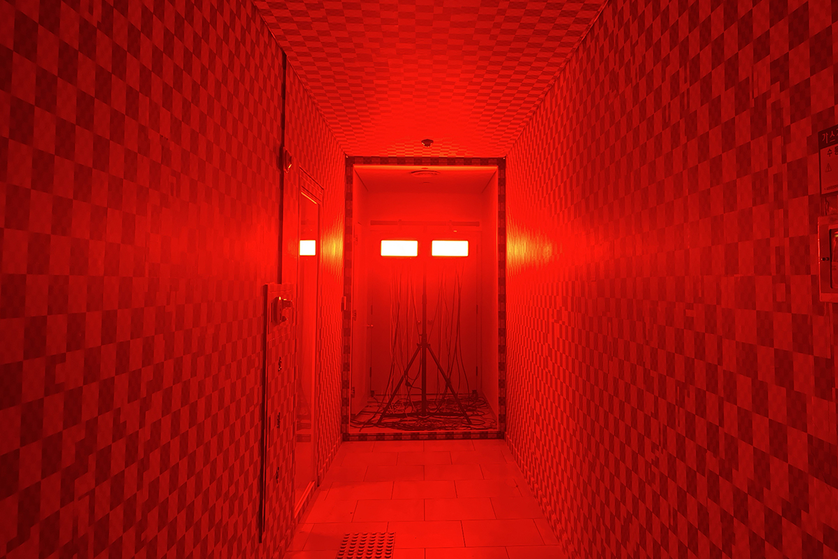 2층 공간에는 격자무늬 벽면의 작은 입구를 통해 새로운 세계로 넘어가는 듯한 공간을 연출했다. 전시장 입구 옆으로는 붉은색의 조명으로 꾸며진 공간이 있다.