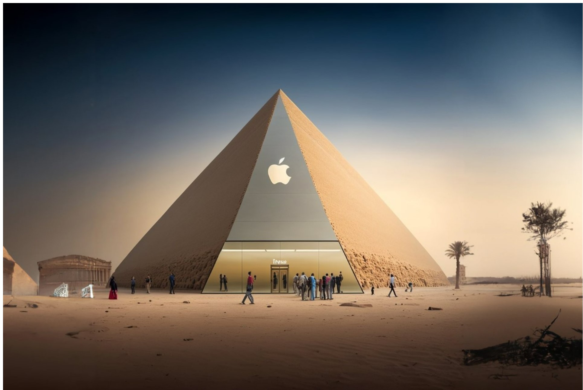 Shail Patel이 소개하고 있는 작품 중 대표적인 작업은 전 세계의 문화적 특성을 반영한 애플 스토어이다. 그는 이미지 생성 AI Midjourney를 활용해서 이집트와 뉴욕 시를 포함한 세계 각지에서 세워진 애플 스토어의 모습을 작업했다. 대표적으로 3가지 작업을 살펴보자.