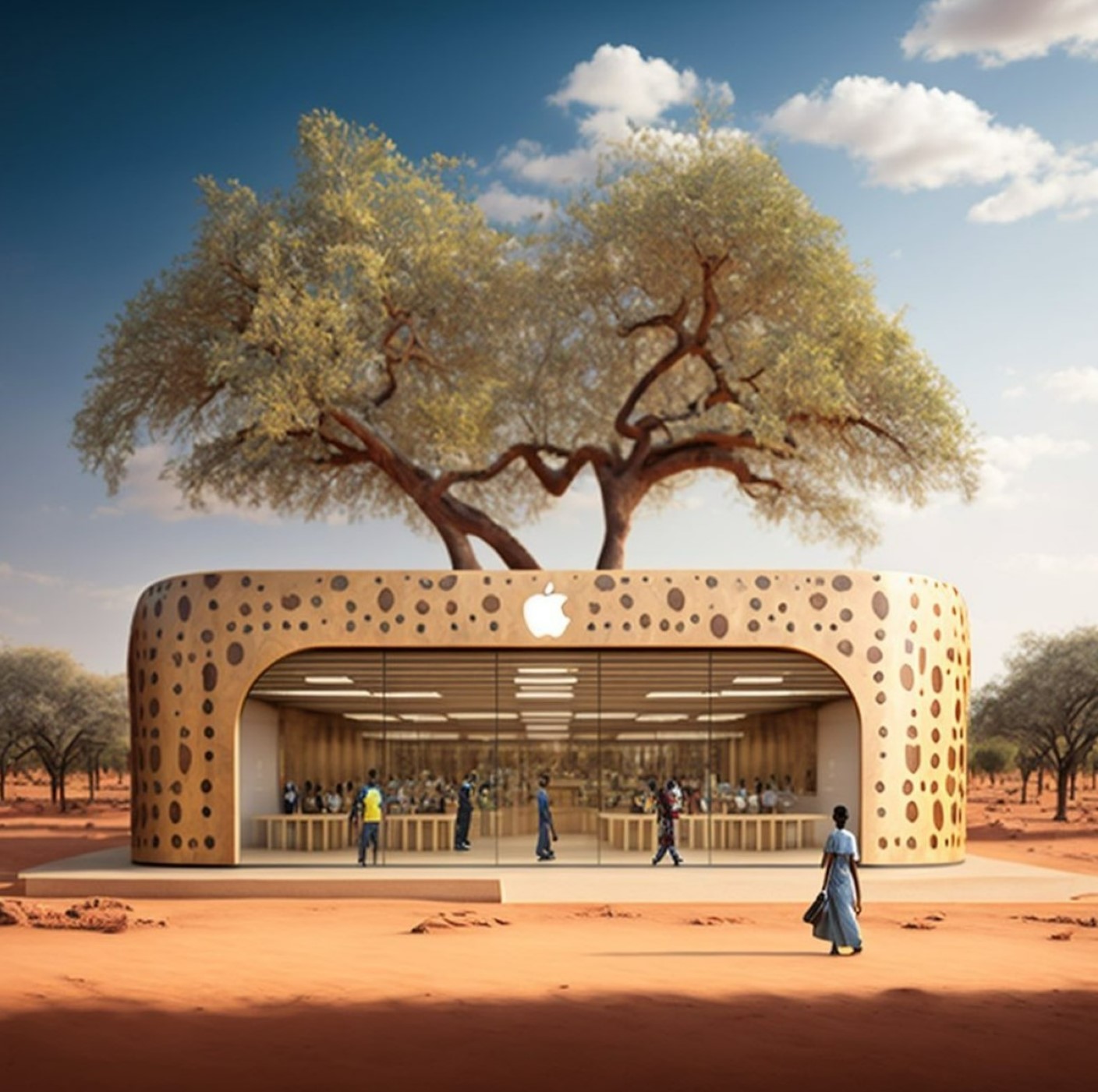 아프리카에 세워진 애플 스토어의 모습은 어떤 모습이 될 수 있을지 상상해 본 작품이다. 특별히 중앙아프리카의 수다노-사헬리언 문화에서 주로 이루어지는 흙과 점토를 활용한 건축 방식이 적용된 모습이 가지는 아름다움을 잘 표현했다. 이 독특한 건축 방식은 남부 이집트와 수단 일부 지역에서 많이 활용이 되었는데, 지역이 가지고 있는 고유의 재료를 활용함과 동시에 기하학적 형태를 보여주는 것이 특징이다. 여기에 통유리로 된 전면 디자인을 통해서 전통적인 문화와 애플이 가지는 세련되고 단순한 느낌을 잘 살려준 아이디어이다.