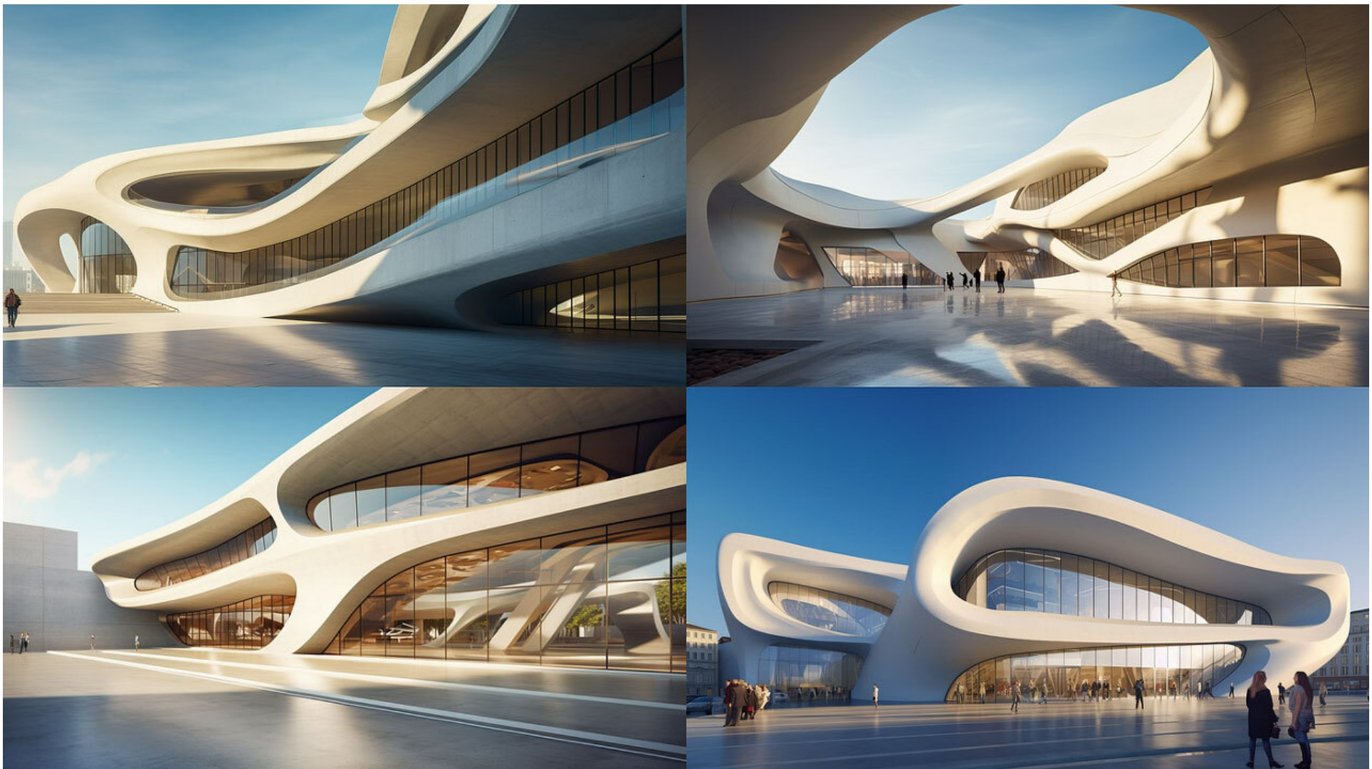 Zaha Hadid 스타일로 생성된 건축 디자인 (by Midjourney)