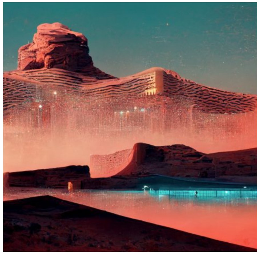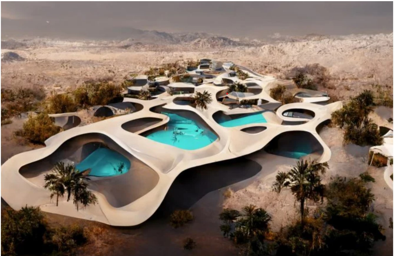 자하 하디드 스튜디오에서 공개한 AI로 생성된 이미지 중에는 사우디 아라비아에서 개발 중인 Neom의 잠재적 프로젝트 아이디어들도 포함이 되어있다. 현재 자하 하디드 스튜디오는 AI 이미지 생성한 결과물들 중에서 10~15%를 선택하여 3D 모델링 단계로 나아가는 방법을 사용하고 있다. 그리고 내부에 AI 연구 그룹을 설립하여 운영 중이다. 생성 AI를 도입한 선도적인 건축 스튜디오의 모습을 잘 보여준다고 생각된다.