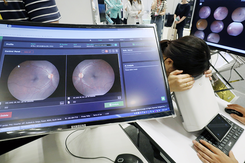 지난해 7월 12일 서울 강남구 코엑스에서 열린 디지털 헬스케어·제약장비 박람회 ‘바이오플러스-인터펙스 코리아 2023’에서 업체 관계자들이 인공지능 망막진단 플랫폼 시연을 하고 있다. (ⓒ뉴스1, 무단 전재-재배포 금지)
