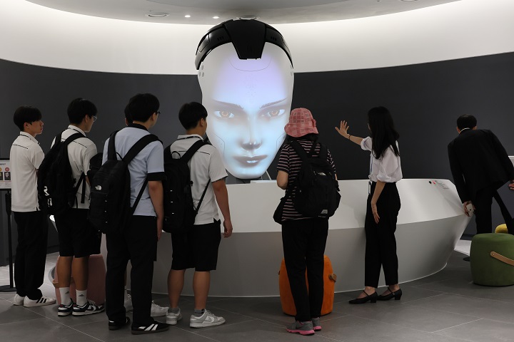 서울 도봉구 서울로봇인공지능과학관(서울RAIM)을 찾은 관람객들이 메타 휴머노이드 마스크봇에 대한 설명을 듣고 있다. 2024.8.20(사진=저작권자(c) 연합뉴스, 무단 전재-재배포 금지)
