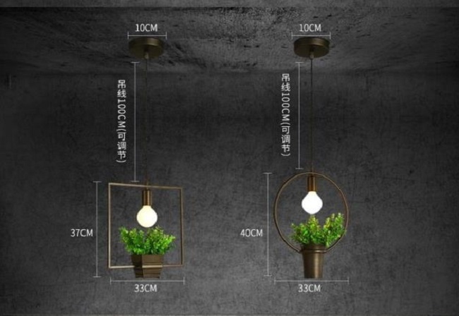 철제틀 형태는 사각형, 원형, 삼각형 등이 있으며 화분 모양도 다양해 심플하지만 결코 심심한 느낌은 주지 않는다. 천장에 매다는 조명선의 길이는 100cm에 달하며 길이 조정이 가능하다. 다양한 길이로 이 조명등을 설치할 경우 실내에 경쾌한 분위기를 더할 수 있다. 선을 제외한 조명등 자체 사이즈는 가로 33cm, 세로 37~40cm로 여러 개를 설치해도 부담스럽지 않다.