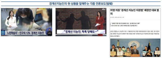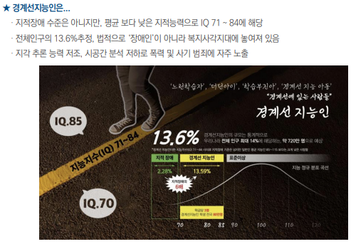 · 최근 언론에서 묻지마범죄, 학교폭력 등으로 경계선 지능인이 이슈가 되며 주목을 받고 있으며, 정치·교육계, 시민단체