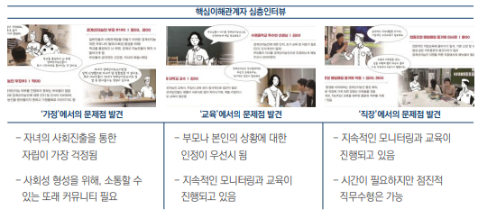 - 가정·교육·직장(취업) 요소를 기준으로 심층인터뷰, 맥락적 관점에서 이해관계자의 감정,태도,행동 관찰·분석