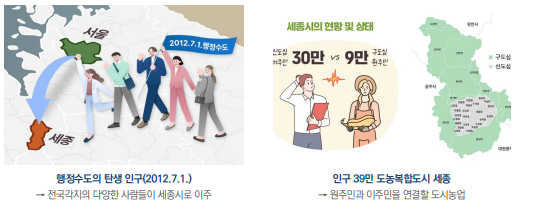 · 세종특별자치시는 정부의 계획하에 만들어진 행정수도로, 기존 농촌 지역에 전국 각지의 사람들이 이주해 도시와