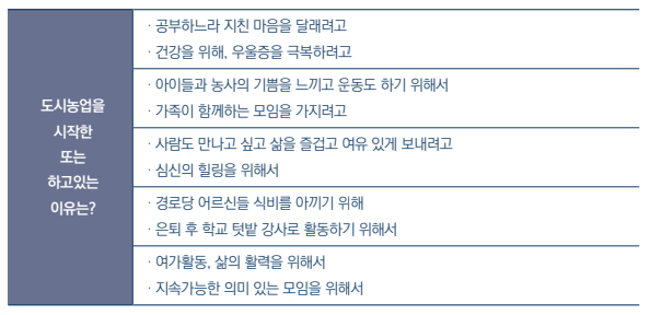 · 도시농업은 보통 세종시에 이주한 후, 은퇴한 후, 남은 시간을 활용하기 위해 관심을 가지게 되었고 도시농업을 할수록