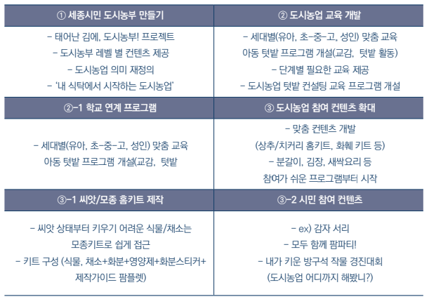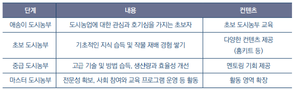 · 국민 눈높이에 맞는 도시농업 컨텐츠를 개발하여 관심과 호기심을 유발하고 도시농부 단계별로 제공하여