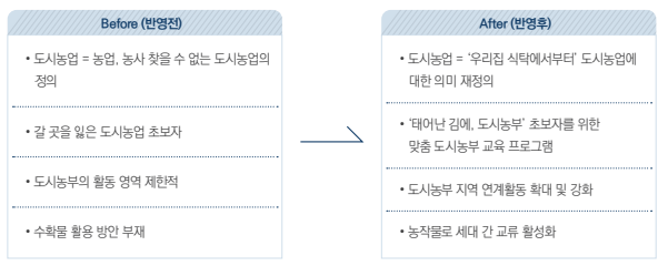 - (post) 도시농업은 경제적이익이 없다 보니 보람을 느낄 수 있도록 하는 다양한 활동이 필요한데
