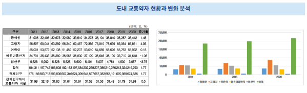 ㅇ 교통약자 인구 수 : (`11년) 18.4만 명 → (`20년) 21.6만 명, 연평균 1.8% 증가