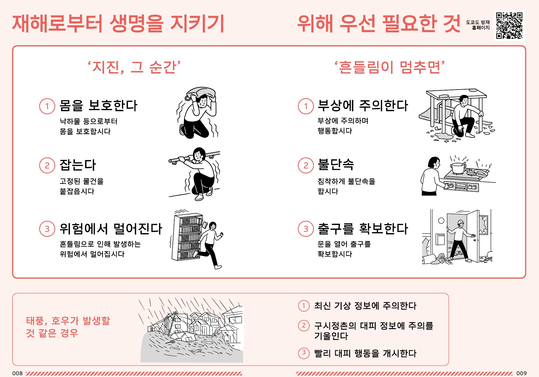 8페이지: 재해 발생 직후 생명을 지키기 위한 즉시 행동 안내