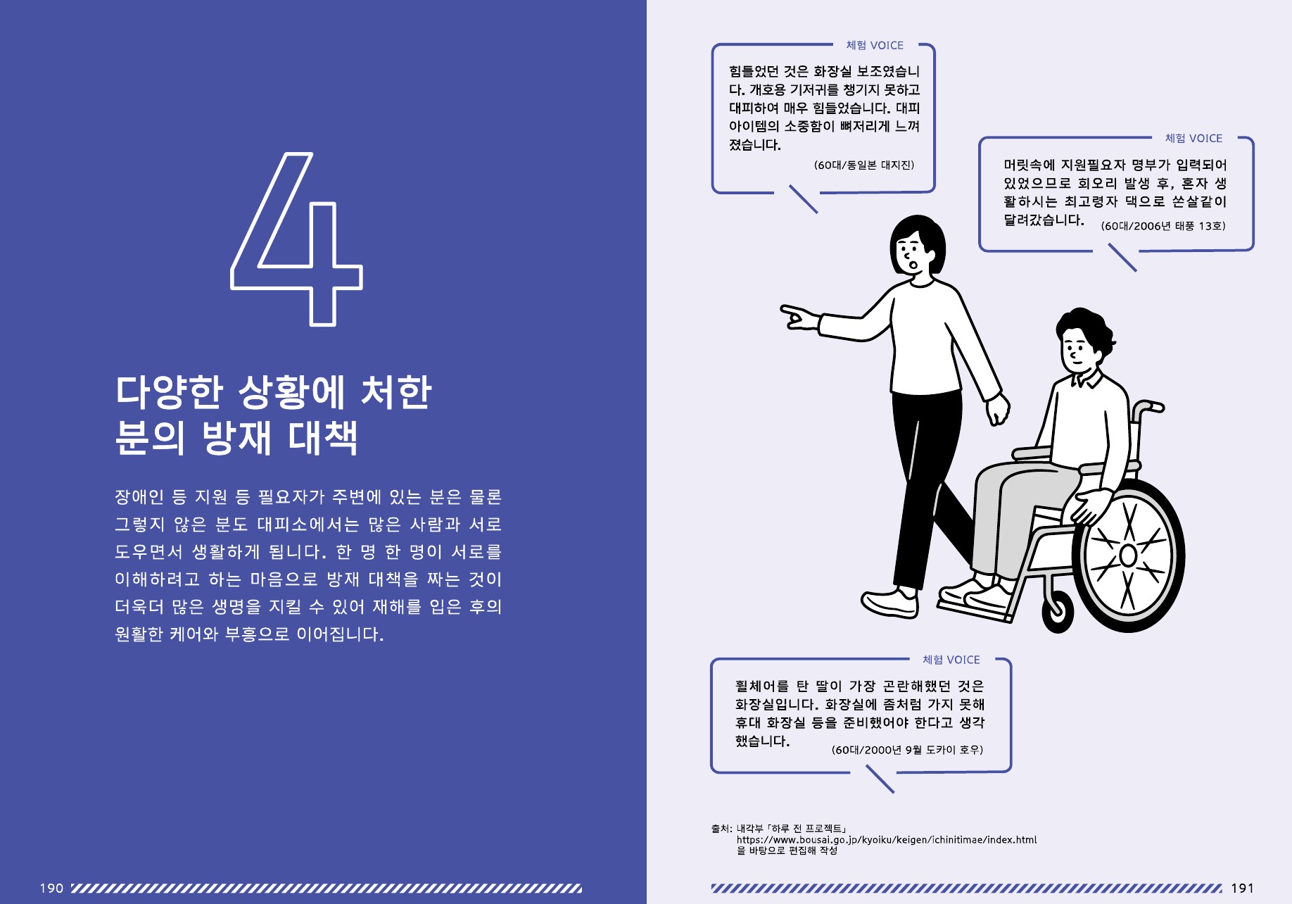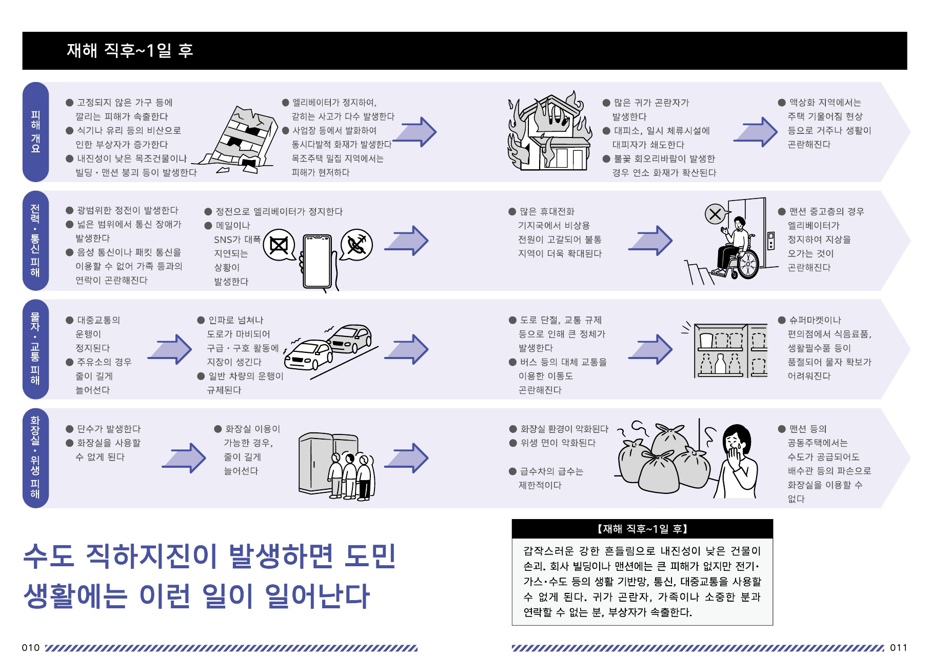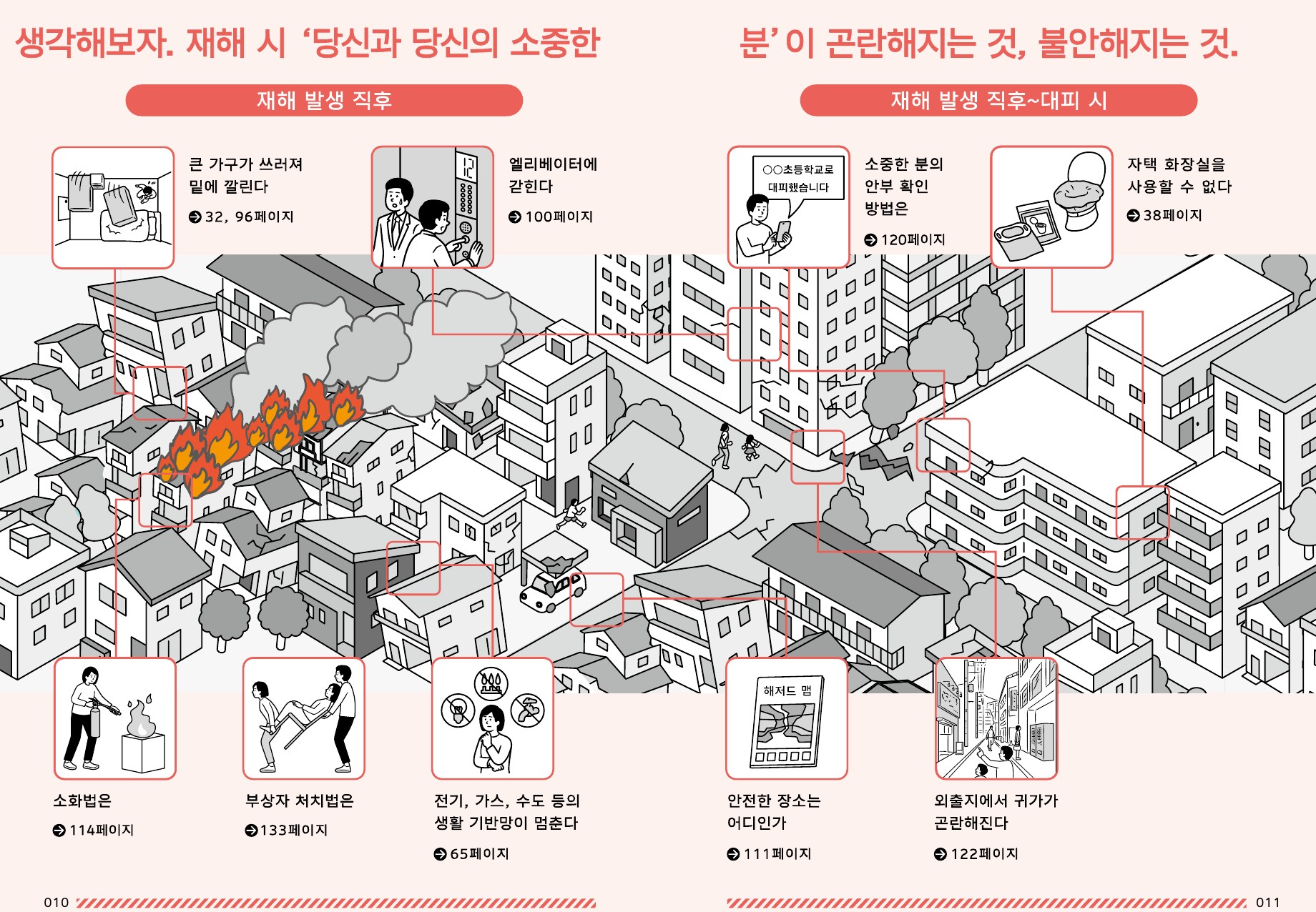 10~13페이지: 발생 직후부터 대피생활까지 필요한 단계별 대응 요령