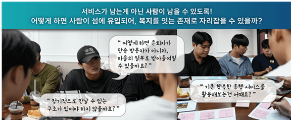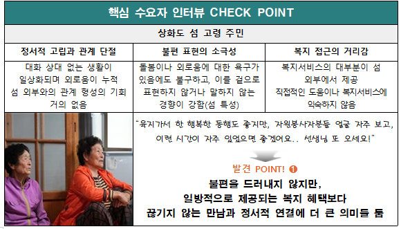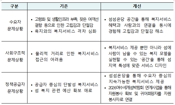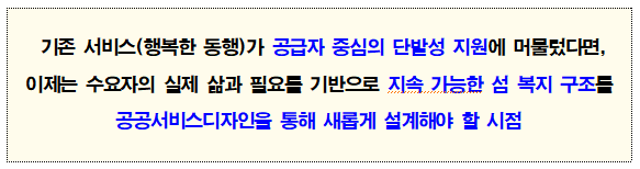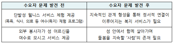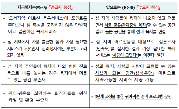 - 수요자 삶과 연결되지 못한 일회성 맞춤형 서비스 : 기존 섬주민 복지 서비스‘행복한 동행’은 섬 주민을 육지로 초청해 목욕‧진료‧식사‧문화 등을 제공한 맞춤형 복지 프로그램이었으나, 기획과 운영이 공급자 중심으로 이루어져 섬 주민의 진짜 니즈를 충족시키지 못함