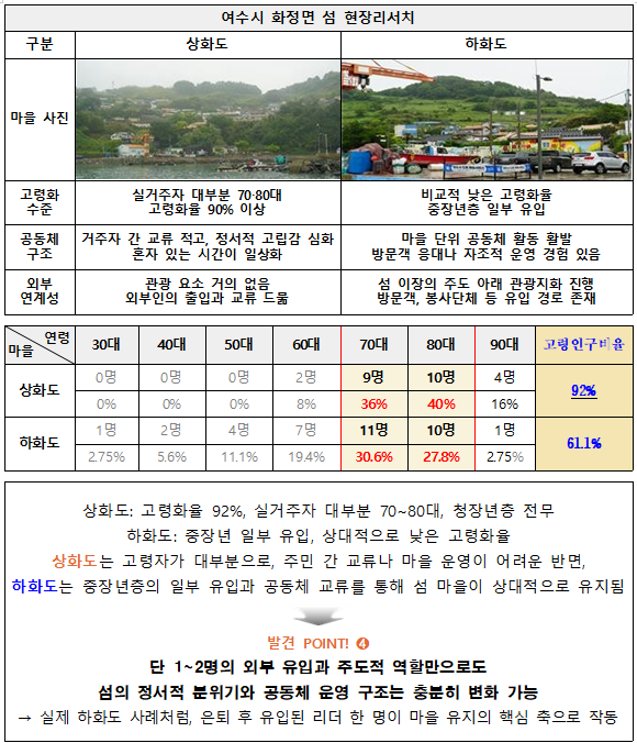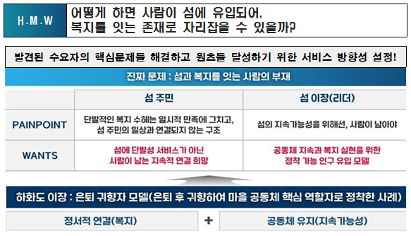 - 자원봉사자·지자체·복지전문가·디자인 전문가 등 다양한 이해관계자와 함께 섬 특성을 분석하고 이전 하화도 이장님의 은퇴 귀향자 모델을 기반으로 인구 유입 모델 방안 모색