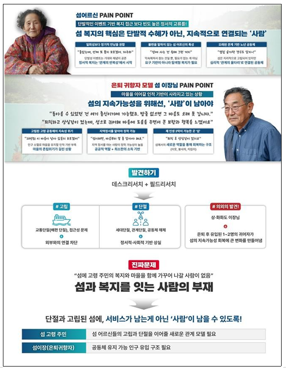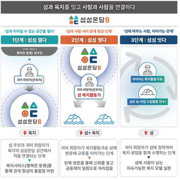 - 단절된 섬과 육지를 잇고 어르신과 은퇴자를 연결하며, 복지라는 이름으로 사람을 남기는 섬 특화 복지모델 브랜딩
