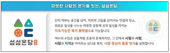 - ‘섬섬온당’은 섬, 섬으로 온 당신이라는 의미와 함께 ‘온(溫)당(當)’, 즉, 따뜻한 공간이라는 뜻을 내포한 브랜드명으로, 섬과 육지를 잇고 사람과 사람을 연결하는 지속가능한 복지 모델 의미