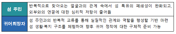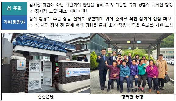 - ‘섬섬온당’은 섬 주민에게는 단절된 일상 속 사람 기반의 돌봄을, 귀어자에게는 역할과 소속을 제공함으로써 사람이 남는 복지 실현과 공동체 회복을 함께 도모할 수 있도록 설계된 서비스