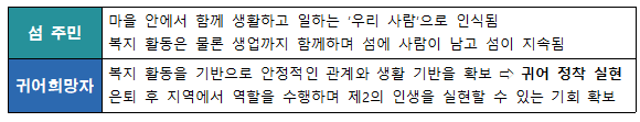 - 귀어 희망자가 섬에 정착하여 복지 활동가로서의 역할을 수행하고, 농‧어업‧관광 등 수익 활동을 통해 자립 기반을 마련하는 단계