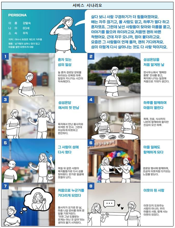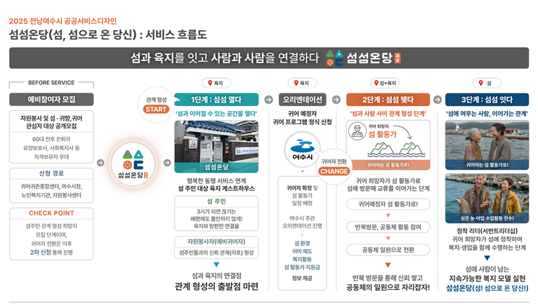 여수시는 섬 지역 고령화와 고립 문제에 대응하기 위해 공공서비스디자인을 적용한 ‘섬섬온당(섬, 섬으로 온 당신)’ 모델을 개발했다. 기존의 공급자 중심 단발성 복지(목욕·진료 서비스 등)에서 벗어나, 섬과 육지를 연결하는 허브 공간을 조성하고 주민·자원봉사자·귀어 희망자가 지속적으로 교류할 수 있는 관계 중심 복지체계를 마련했다.