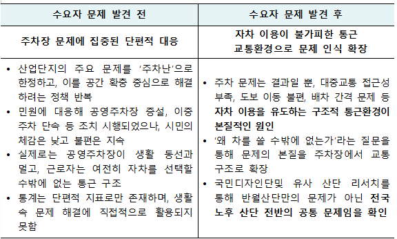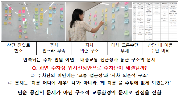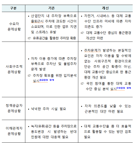- 주차 문제는 나타나는 결과일 뿐, 산업단지 내부의 부실한 대중교통 이용환경과 같은 자차 의존도를 높여 주차 수요를 과도하게 발생시키는 구조가 본질적인 문제