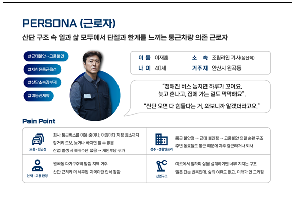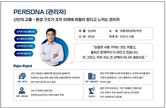 ○ 퍼소나 : 퍼소나 설정을 통해 노후산단에서 겪는 교통 문제 발견