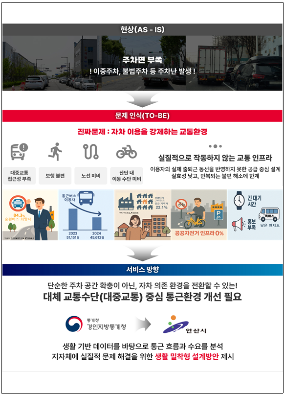 - 최근 안산시에서는 주차장 부족, 불법주차 등 교통 관련 민원 증가, 특히 반월산업단지의 주차난이 핵심 이슈로 부상